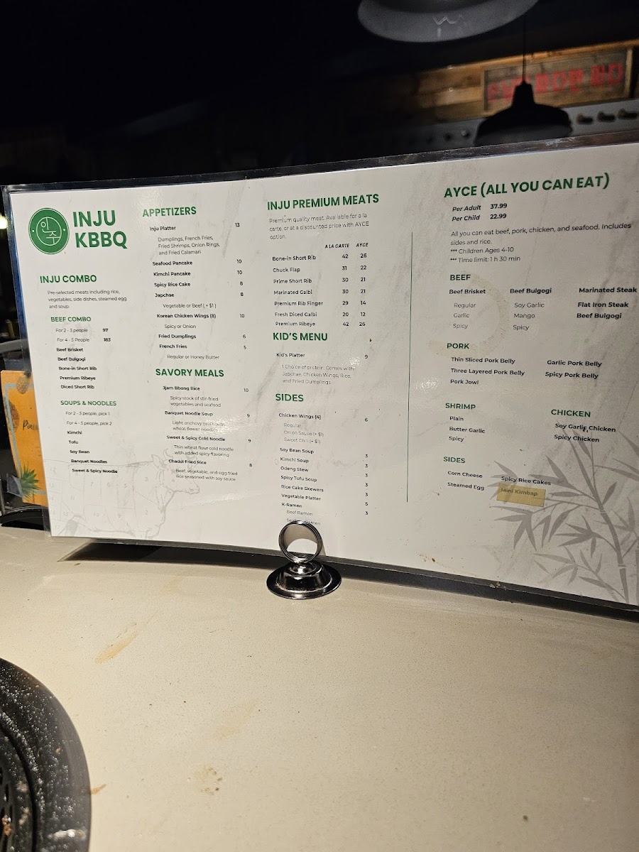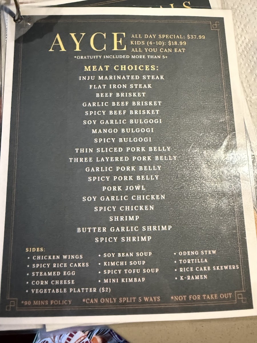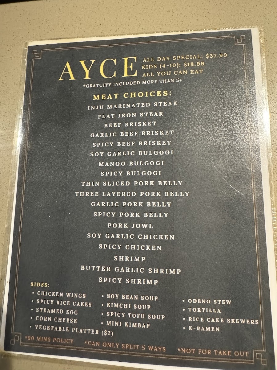 Rice, soy garlic beef bulgogi, spicy beef bulgogi, fried chicken, fried dumplings, and lettuce salad.