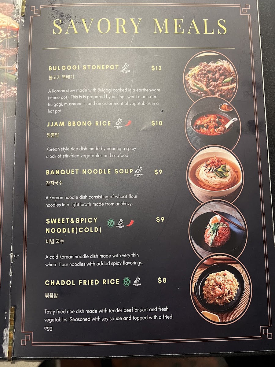 Rice, 1 choice of protein, Pink Radish, Fish Cake, and Japchae (stir fried noodle).